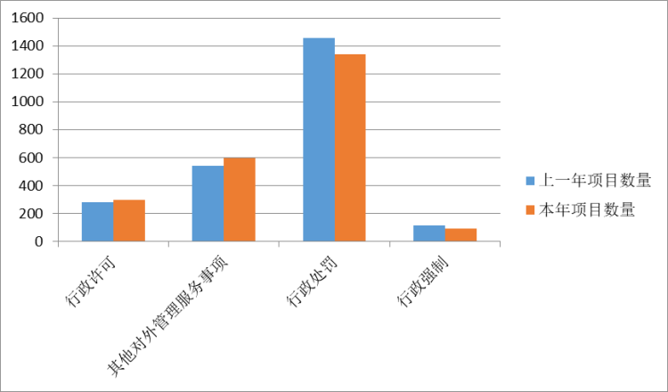 (二)上一年行政许可事项数量为281项,本年增加18项,本年处理决定数量为10468件;上一年其他对外管理服务事项为542项,本年增加56项,本年处理决定数量为396145件。上一年行政处罚数量为1459项,本年减少119项,本年处理决定数量为1447件;上一年行政强制数量为112项,本年减少23项,本年处理决定数量为1068件。